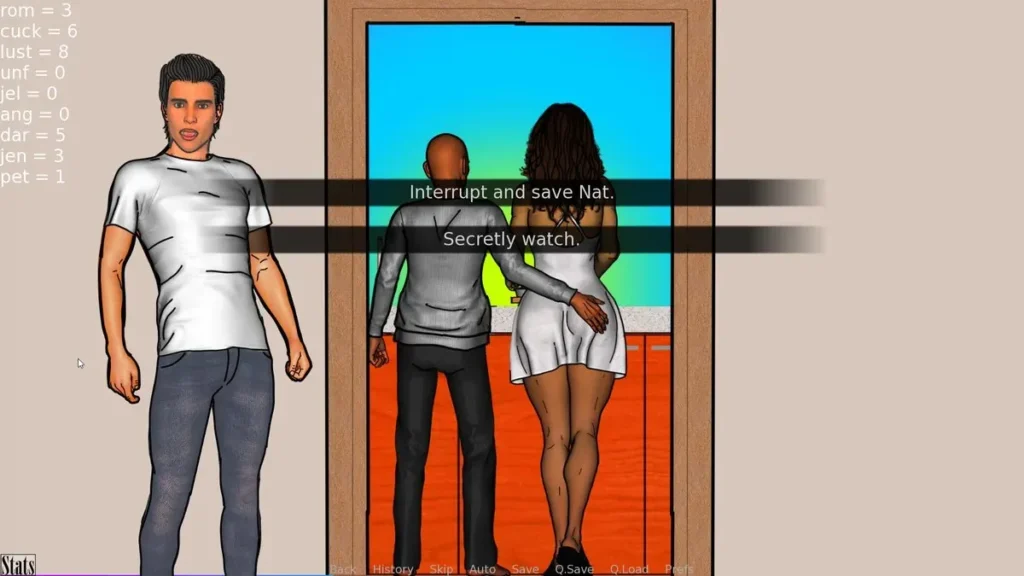 Want Darnell to be a possessive, traditional partner? You’ll pump points into Jealousy and Anger. Want to explore a more open, thrilling dynamic? Choices that increase Lust and Cuck might be your path. Or perhaps you want to champion pure, unwavering romance above all else? Focus on Rom. The genius is that these stats are often in tension. Defending Nat might raise Romance but also Anger. Turning a blind eye to a flirtation might increase Lust but also Cuck. It’s a constant, delicious balancing act.