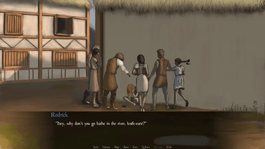 A crucial note on tone and content: Given its setting, Elvensang engages with mature themes in Elvensang. You will encounter racial hatred, verbal abuse, moments of physical danger, and scenarios dealing with poverty and loss. The game sometimes explores these mature themes with unflinching realism to sell its oppressive atmosphere.